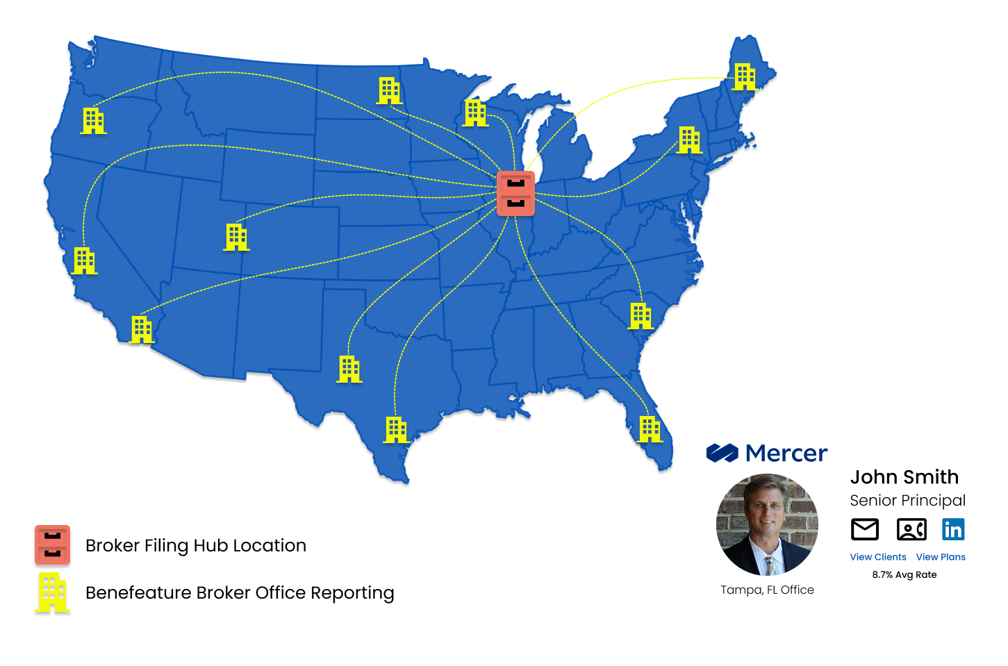 Benefeature doesn't guess. We use advanced data modeling to identify the actual broker offices where benefit plans were written.